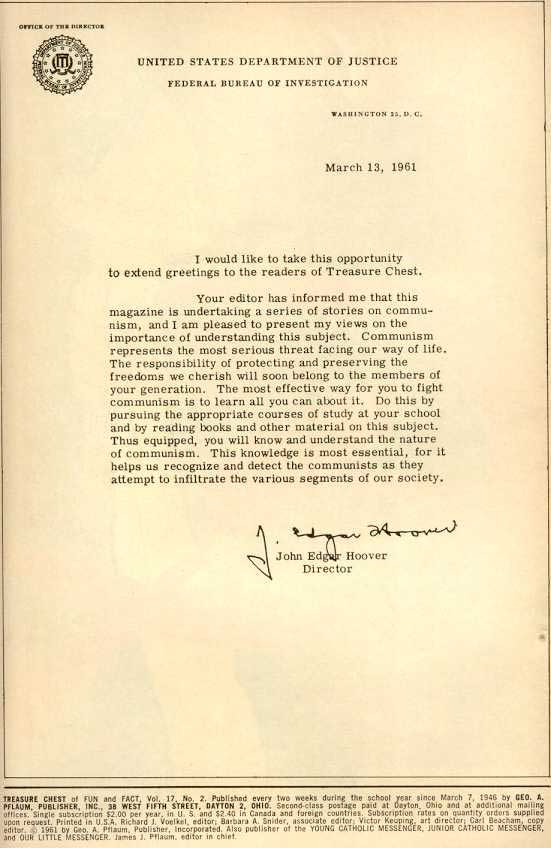 Redaktøren har fortalt meg at bladet no sett i gong ei rekkje historier om kommunismen, og eg vil gjerne få leggje fram mitt syn på kor viktig det er å forstå dette emnet. Kommunismen er det alvorlegaste trugsmålet mot måten vi lever på. Snart vil dykkar generasjon få ansvaret for å verne om og ta vare på den fridomen vi skattar så høgt. Den mest effektive måten å kjempe mot kommunismen på, er ved å lære så mykje du kan om han. Dette gjer du ved å følgje passande kurs på skolen din og ved å lese bøker og andre tekstar om emnet. Utstyrt med denne kunnskapen vil du forstå kommunismens natur. Det er ein kunnskap som er livsviktig, for han hjelper oss å kjenne att og avsløre kommunistar når dei freistar å infiltrere ulike delar av samfunnet vårt.