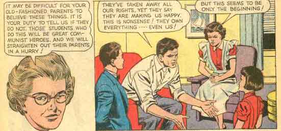 - Det vert kan hende vanskeleg for dei gammaldagse foreldra dykkar å tru på dette. Det er dykkar plikt å seie frå til oss, om dei ikkje gjer det. Elevar som følgjer dette, vil verte store kommunistheltar. Og vi vil få orden på foreldra dykkar kjapt.