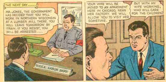- Herr Jones. Styresmaktene har vedteke at du skal arbeide på eit sagbruk i nord-Wisconsin. Du reiser med toget i morgon. Om du protesterer, vert du arrestert ... Kona di vil verte flytta til eit husvere i Chicago, like ved fabrikken. Du vil få vitje ho no og då.