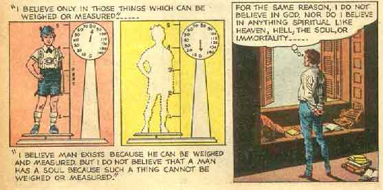 - Eg trur berre på slike ting som kan vegast eller målast. Eg trur mennesket finst berre av di det kan vegast og målast. Men eg trur ikkje at det har sjel, for slikt kan ikkje vegast eller målast.