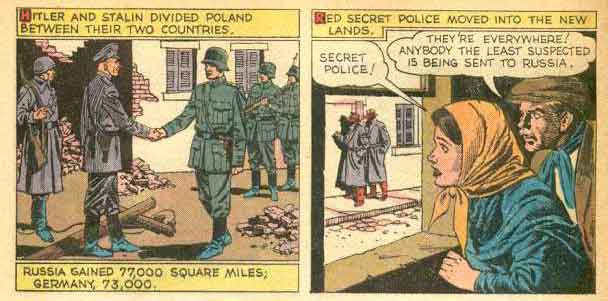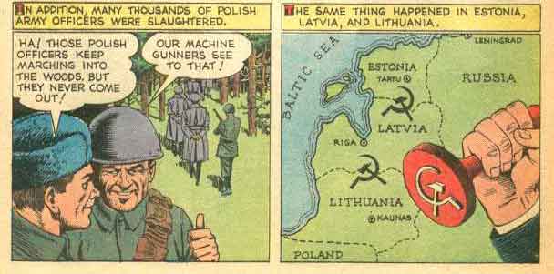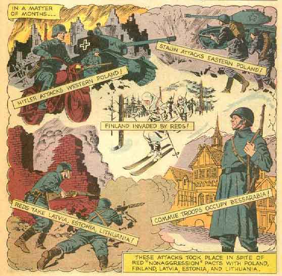 I løpet av nokre månader: Stalin angrip Aust-Polen. Hitler angrip Vest-Polen. Dei raude invaderer Finland. Dei raude tek Latvia, Estland og Litauen. Kommunisttroppar okkuperer Bessarabia. Dette skjedde trass i at dei raude hadde ikkje-åtaks-pakter med Polen, Finland, Latvia, Estland og Litauen.