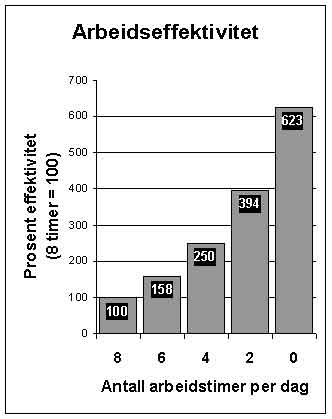Som dere ser, arbeiderkvinner: Jo færre timer dere jobber, jo friskere og raskere blir dere og jo mer øker produktiviteten. Legg merke til at den maksimale uttellinga, 623 %, beviselig kommer ved null timer. Husk å kreve betalt spisepause.