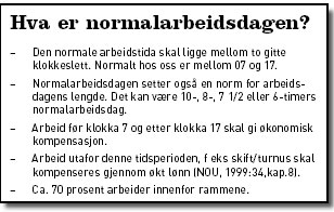 Det gis ei normal ramme som arbeidstida skal ligge innenfor. Denne ramma kan være litt forskjellig i de ulike tariffområdene, men er stort sett satt til tida mellom klokka 07 og klokka 17 slik det er i LO/NHO-området. Det anses altså i vårt samfunn som normalt å ha arbeidstid inna for dette tidsrommet. Det andre elementet ved normalarbeidsdagsbegrepet handler om et normalt antall timer man skal jobbe. I dag er dette avtalefesta til 7,5 timer pr dag eller 37,5 timers uke. Normalarbeidsdagen regulerer altså hva som er normalt antall timer å jobbe og når på døgnet dette arbeidet normalt skal gjøres. Arbeid utenfor ramma som normalarbeidsdagen setter, gir rett til økonomisk kompensasjon for ubekvem arbeidstid. Dette gjelder for eksempel dem som jobber turnus og skift.