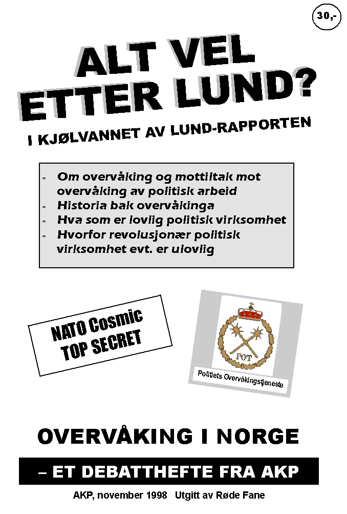 I kjølvannet av Lund-rapporten om overvåkinga i Norge, var det flere folk fra de forskjelligste politiske avskygninger som gjorde seg til talspersoner for lignende standpunkter, fra Håkon Lie, via Torbjørn Jagland til Erik Solheim, seinere i prosessen også flere prominente personer. I og for seg er det jo en logikk i dette standpunktet - for oss. For kommunister bekrefter det analysa vår av borgerskapet og av staten som et redskap i en klasses undertrykking av en annen.