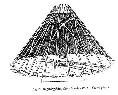 Samisk gamme med bogestangskontruksjon. Kopiert frå Inger Zachrisson: Möten i gränsland (1997), side 123. Opphavleg er figuren henta frå Ernst Manker (1944): Lapsk kultur vid Stora Luleälvs källsjöar.