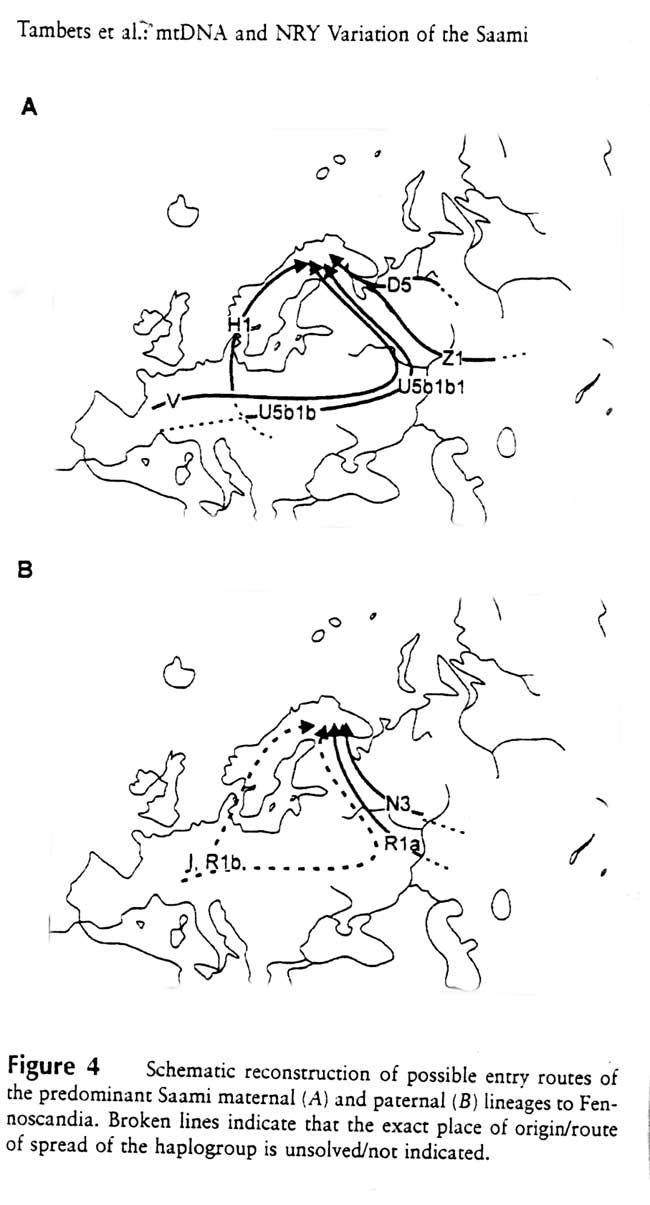 "... omtrent heile arven av mtDNA og Y-kromosom hos samar kan gis tilfredsstillande forklaring innanfor den europeiske genpolen. Denne genetisk baserte rekonstruksjonen (fig. 4) er i samsvar med den rekonstruerte spreiinga av dei mesolittiske Ahrensburg- og Swiderien-teknologiane i Nord-Europa, og knyt dei til folkevandringar slik me har grunn til å tru dei gjekk føre seg då isen smelta og folk rekoloniserte Nord-Europa." (7)