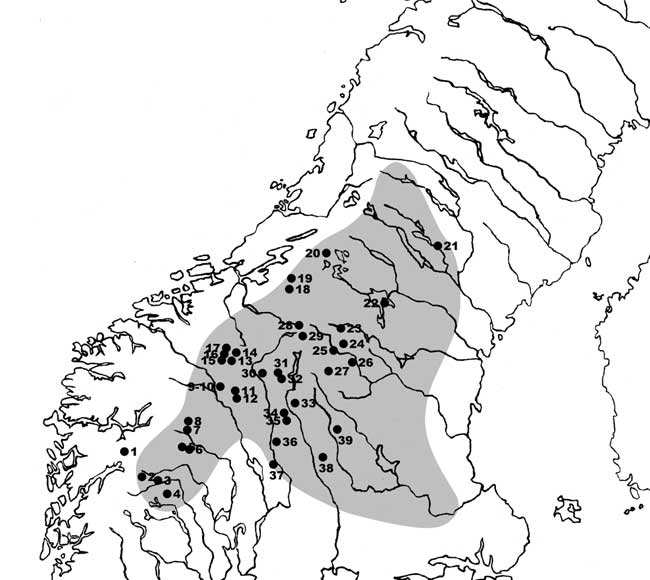 Fangstmarksgraver (fjellgraver og innsjøgraver), bygd på Zachrisson (1997): Möten i gränsland (spesielt kart av Gollwitzer, side 32, og kart av Sundström, side 196); Skjølsvold (1980) i Viking 43, side 140-160. Grått område viser til kart hos Bergstøl (1997): Varia 42.