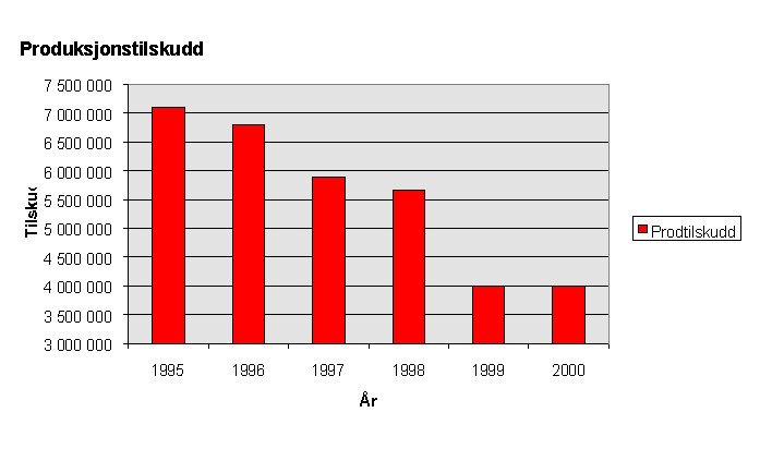 En meget viktig ting er pressestøtta. Den får vi i to ulike former, via statsannonser som statlige instanser er forplikta til å tegne, og gjennom den direkte produksjonsstøtta. Produksjonsstøtta har gått dramatisk ned de siste åra. Se diagram under. Tallene for år 2000 ser ut til å bli noenlunde som i år, men dette er ikke avgjort. Siden 1995 har vi mista 44% av produksjonsstøtte, om vi tar hensyn til prisstigningen er realnedgangen ca 52%. Vi vet at de store mediakonsernene presser på for å redusere produksjonsstøtta for å presse småavisene ut av markedet. Dette er en illevarslende utvikling.