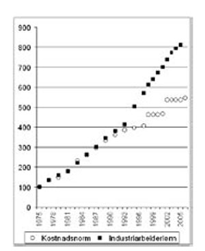 Indeks for Lånekassas kostnadsnorm og industriarbeiderlønn. 1975=100.